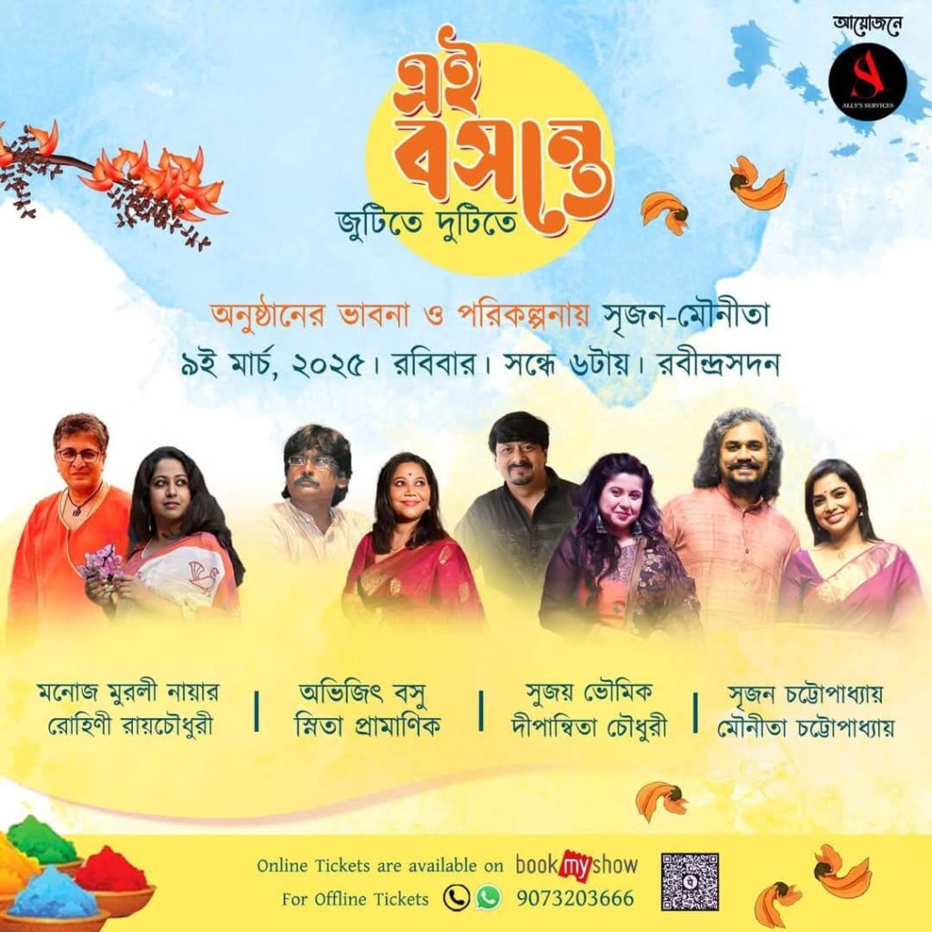 If spring fills the air with love, Ally’s Services makes sure it lingers through music and memories. One such special evening was 'Ei Basante: Jutite Dutite', held at Rabindra Sadan on March 9, 2025. Four wonderful pairs namely Manoj Murali Nair & Rohini Roy Chowdhury, Abhijit Basu & Snita Pramanik, Sujoy Bhowmik & Deepanwita Chowdhury, and Srijan & Mounita Chattopadhyay, brought the stage to life with music and poetry, making it a night to remember. Here's giving you snapshots of all that special happened from the event, 'Ei Basante: Jutite Dutite' organised by Ally's Services.